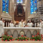 Četvrti simbol Svetog Ivana, orao, ima natpis: VERBV(M) CARO FACTV(M) EST ET HABITAVIT IN NOBIS (Riječ je tijelom postala i prebivala u nama). A anđeo, kao simbol Svetog Mateja, objeručke drži eliptičnu središnju kompoziciju slike, a ostale tri figure koje simboliziraju ostalu trojicu evanđelista dotiču njezin eliptični naslikani okvir. Orao ga dira pandžama, lav šapom, a bik to čini rogom. Ti detalji, uz natpise s atributima evanđelista, ističu činjenicu da su teološke poruke slike utemeljene na svetopisamskim riječima četvorice evanđelista. A aurelola Boga Oca na vrhu u toj naslikanoj eleptičnoj „međi.Crkve“, kao da sve to potvrđuje. U središnjem dijelu kompozicije slike zorno je istaknuta istina o spasu čovjeka nakon njegovog pada. Gornji dio slike, ispod Gospina plašta, koji predočava raj, organiziran je u dva reda, i to u dva odvojena kruga muških i dva kruga ženskih svetaca. U nebeskoj Crkvi, s desne strane nalaze se muškarci s aureolama. Skupinu u gornjem redu predvodi Sveti Ivan Krstitelj s apostolima.